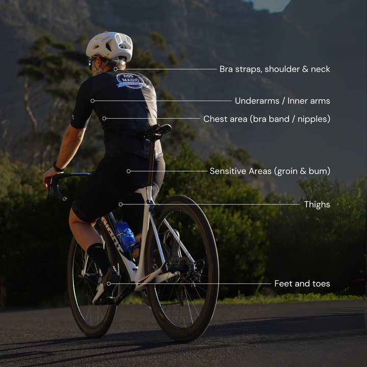 Apply a generous amount directly to areas prone to chafing or to the chamois of your cycling shorts before riding. Always use clean hands and avoid double-dipping.